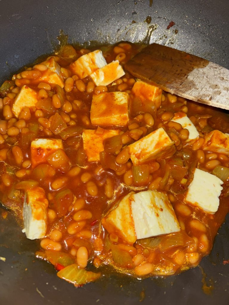- Next, stir in the tomato purée and cook for one more minute. Now, tip in the entire tin of baked beans (sauce and all!) and the fried paneer cubes. Give it all a good stir to combine.