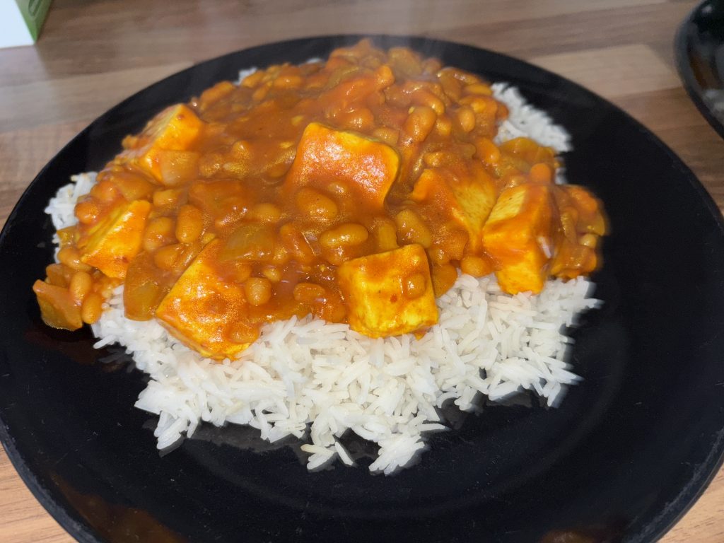 It’s a mad-sounding but truly brilliant combination of a classic tin of baked beans, paneer and warming Indian spices. Trust me, it works! The beans in their tomato sauce add a lovely sweetness and body that is just wonderful. For the chilli, I used a fresh red one from my garden for a nice kick, but you can use a pinch of chilli flakes or leave it out entirely if you’re not a fan of heat. Quick and full of flavour, this makes a fantastic midweek meal and serves two generously, three if you’re adding chips, as I did.